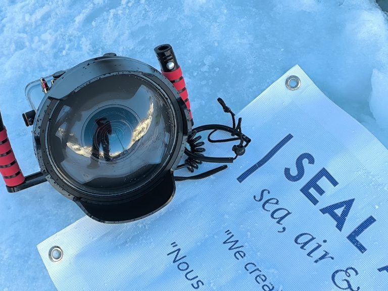 Ouvert à tous. En plongée sous-marine, en apnée, en snorkeling ou même à plat ventre au bord de la glace sans mise à l'eau comme sur cette image, découvrez le monde fascinant de la photographie sous glace.